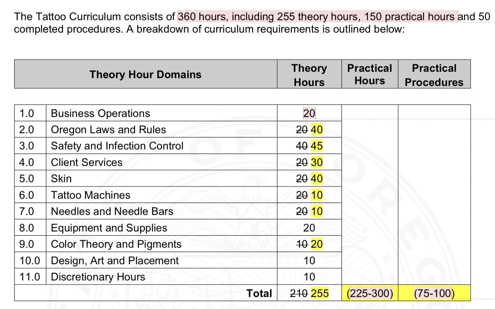 A HUGE issue that continuously came up (and a large reason why this committee was very conservative with the increases that were decided on) is that ARTISTIC and COSMETIC tattooing live under the SAME license in the state of Oregon. In order to make sure this curriculum works for everyone for the time being until we can get these licenses separated, they have to be considered as a whole. This proved challenging to provide solutions that worked for everyone. The last time this curriculum was adjusted was 2017, and a lot has changed. In order to modernize it, certain touchstones were added to include things like digital payments and consent guidelines.